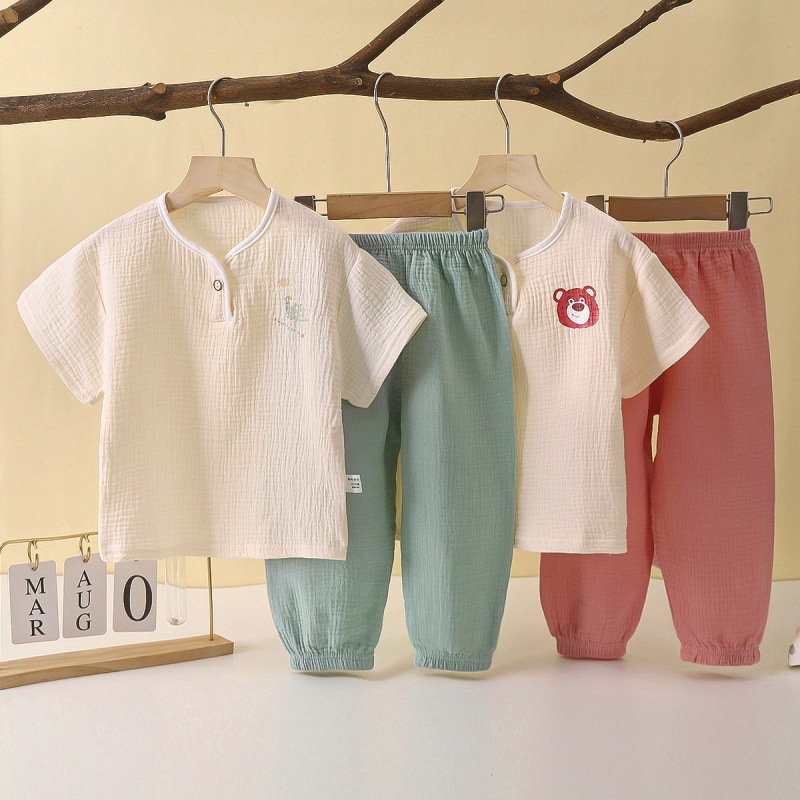 子供の中国風のセットのガーゼのパジャマの夏の女の子の純綿の家庭服のゆったりしている男の子の赤ちゃんのエアコンのセット