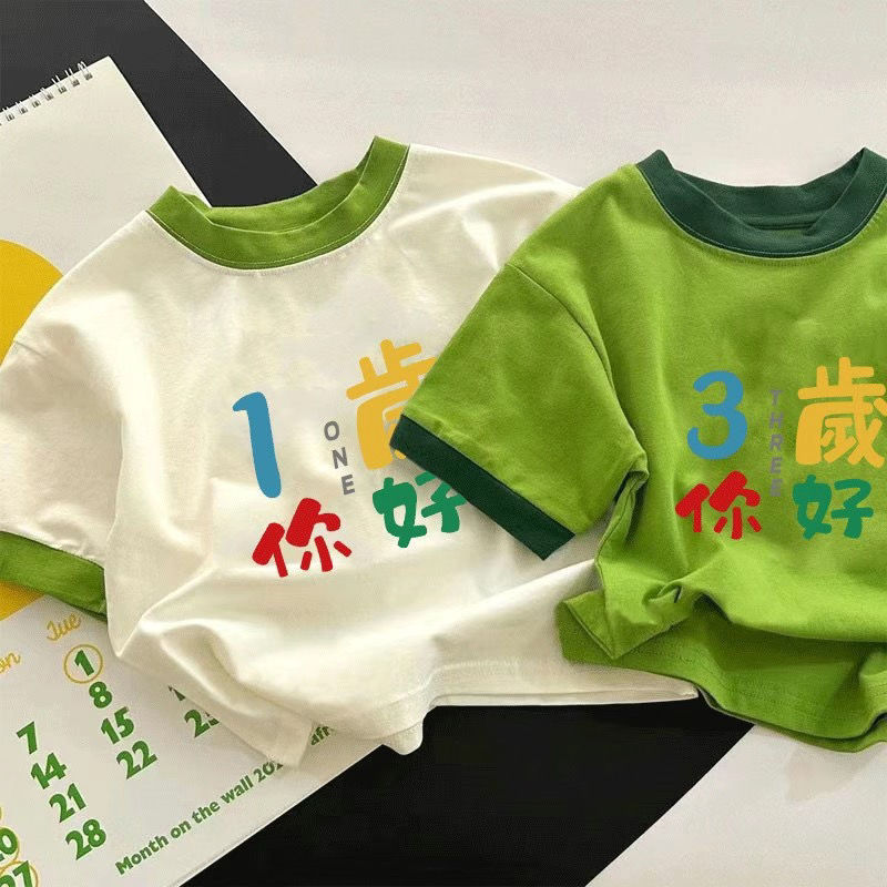 子供の赤ちゃんの新しい歳の誕生日の数字の洋気の男の子の女の子の夏服の半袖の写真はシャツの半袖の上着を撮影します。
