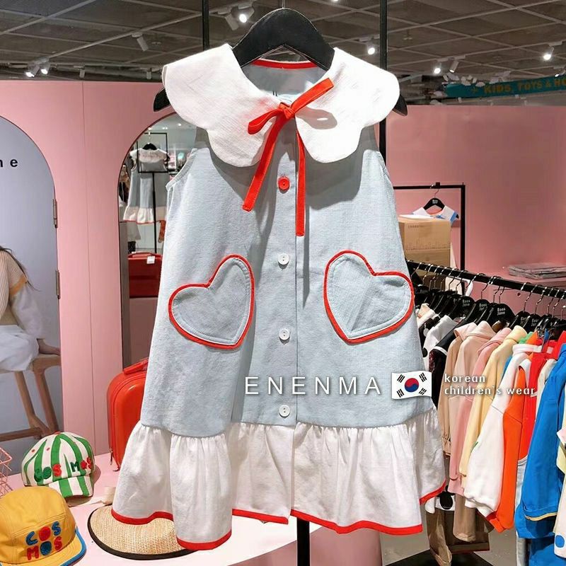 韓国の子供服2024夏の女の子のハスの葉の襟の袖なしのワンピースの子供の洋風の愛のストラップのベストのスカート