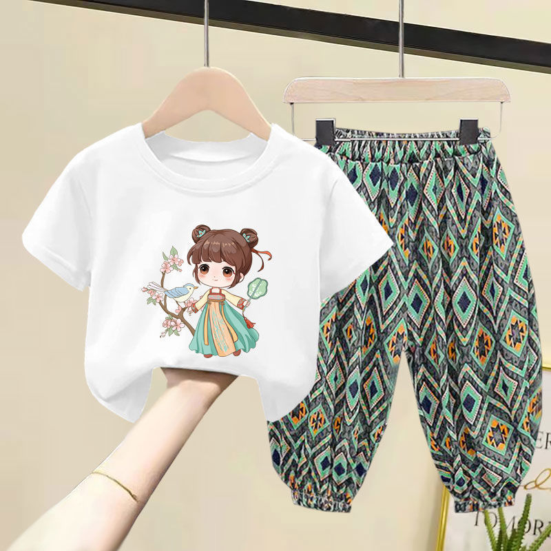 女の子スーツ2024夏服新型子供服純綿tシャツ半袖女赤ちゃん半袖ズボン2枚セット