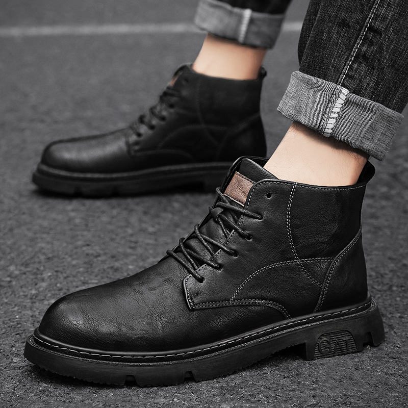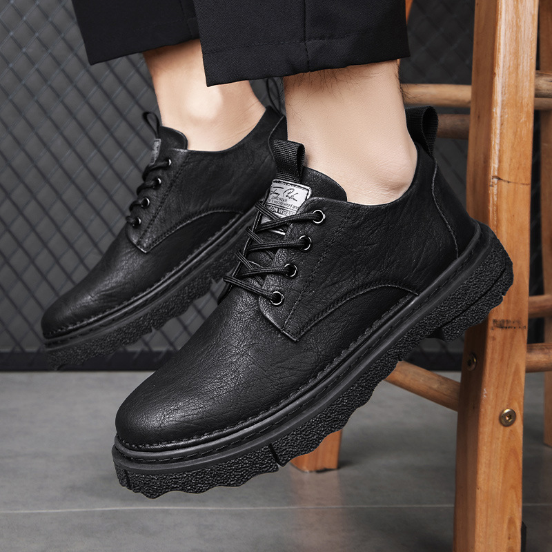 工装靴男春男靴英倫風マーティンブーツ丸頭黒色低助レジャー革靴大頭真皮靴