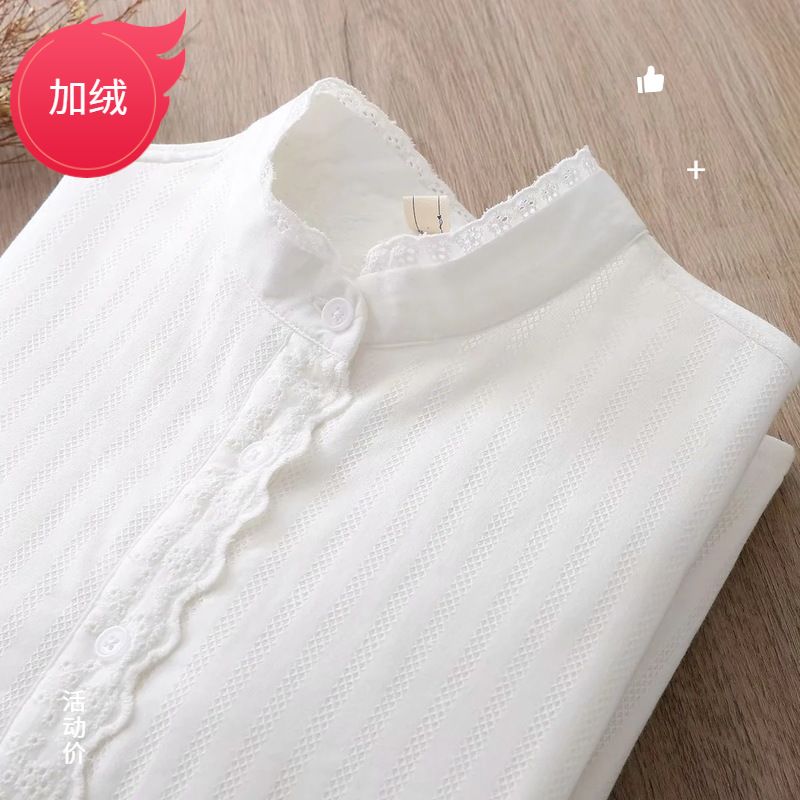 828韓国版秋冬ベルベット厚手長袖シャツ女子レース立襟百合白シャツ