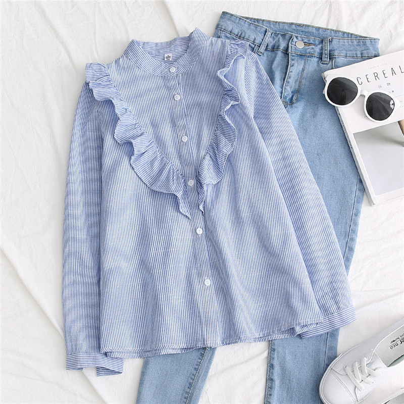 67120卸売り春秋装立襟ハスの葉の縁の縞のシャツの女性の韓国版の長袖は底のゆったりしているシャツの婦人服を打ちます。