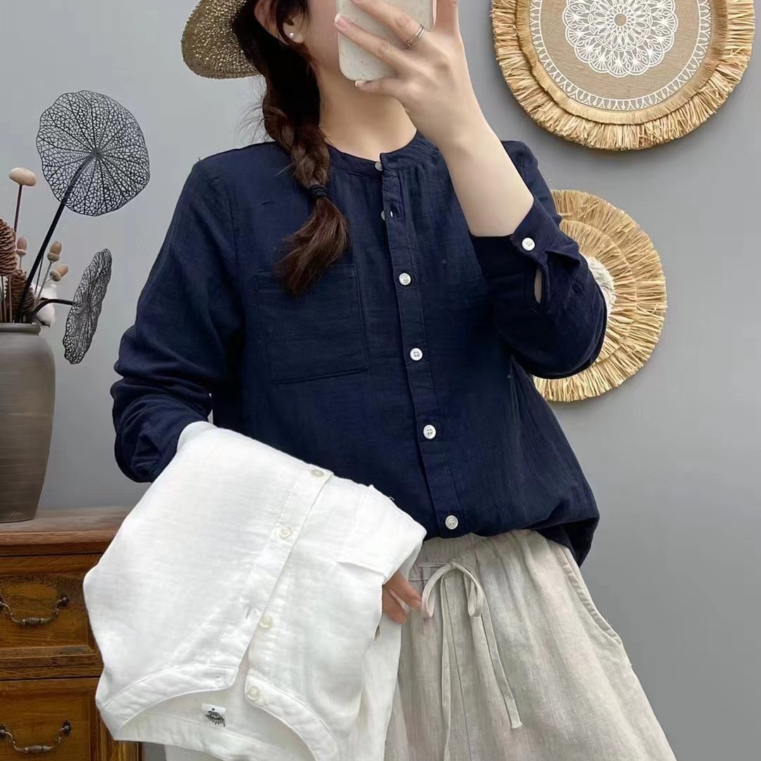 8501早春シンプルで快適な立襟二重綿糸シャツ女性2024春秋新作カジュアルで痩せた上着