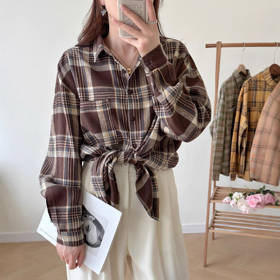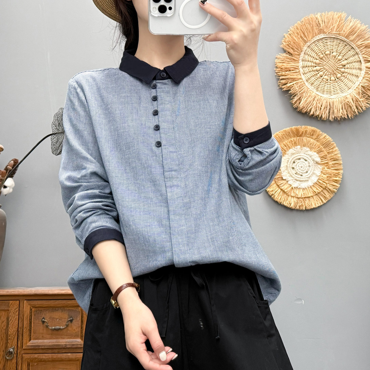 81618文芸格子縞二重綿糸折り襟長袖シャツ女2023秋装新型ゆるい着痩せシャツ