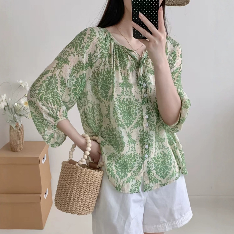 22602丸首帯プリント天糸シャツ女2024春夏薄いシルク生地七分袖日焼け止めシャツ