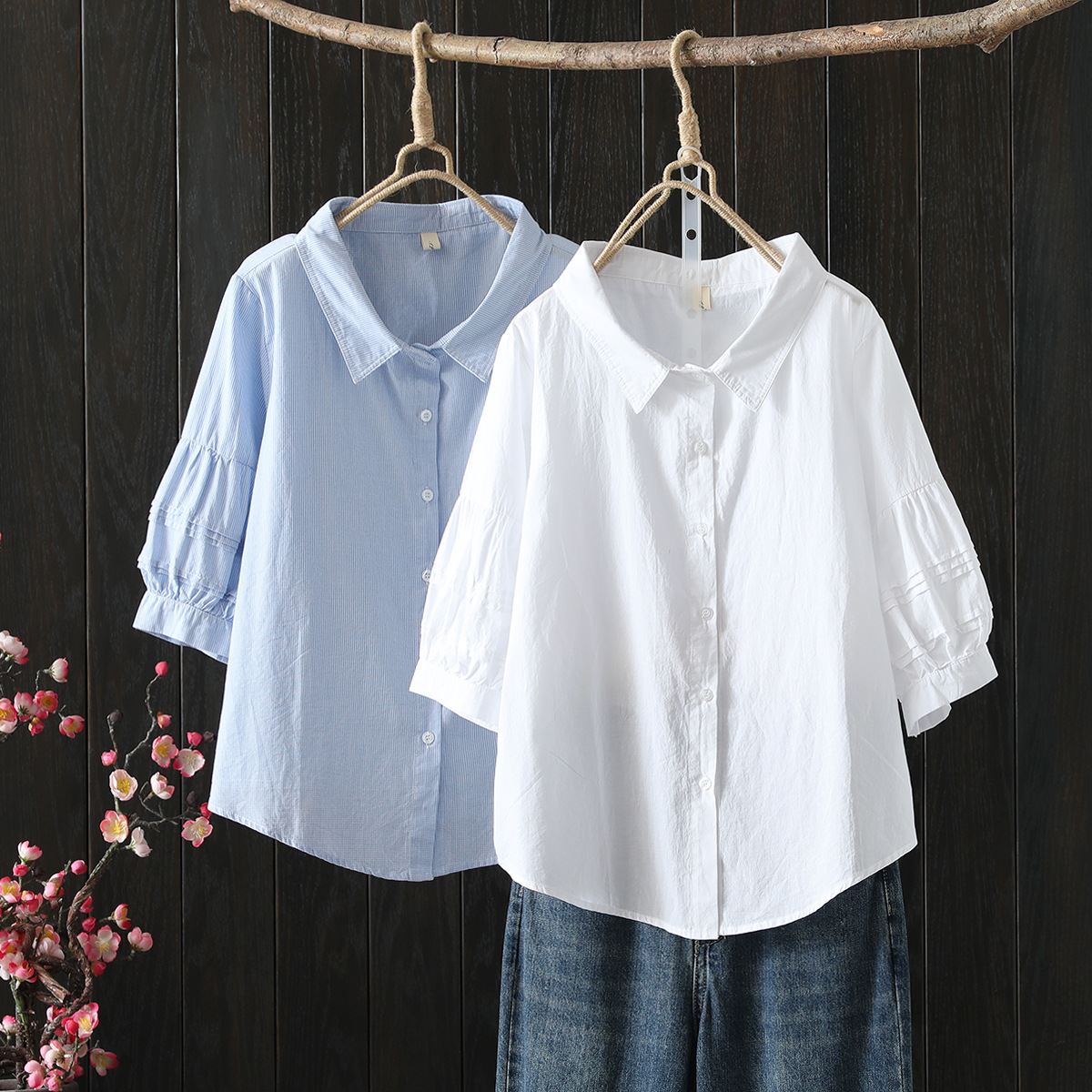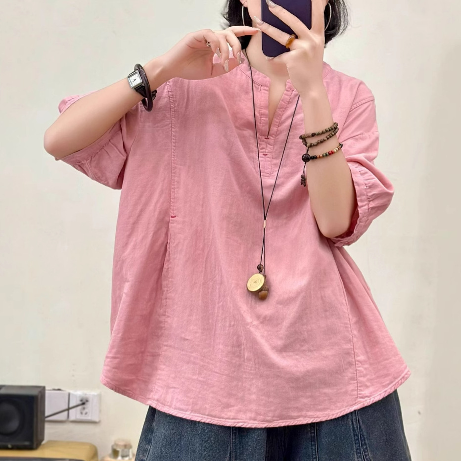 25062森系夏モデル新商品二重糸シャツ文芸ネット版ファッションゆるいカジュアルvネック半袖