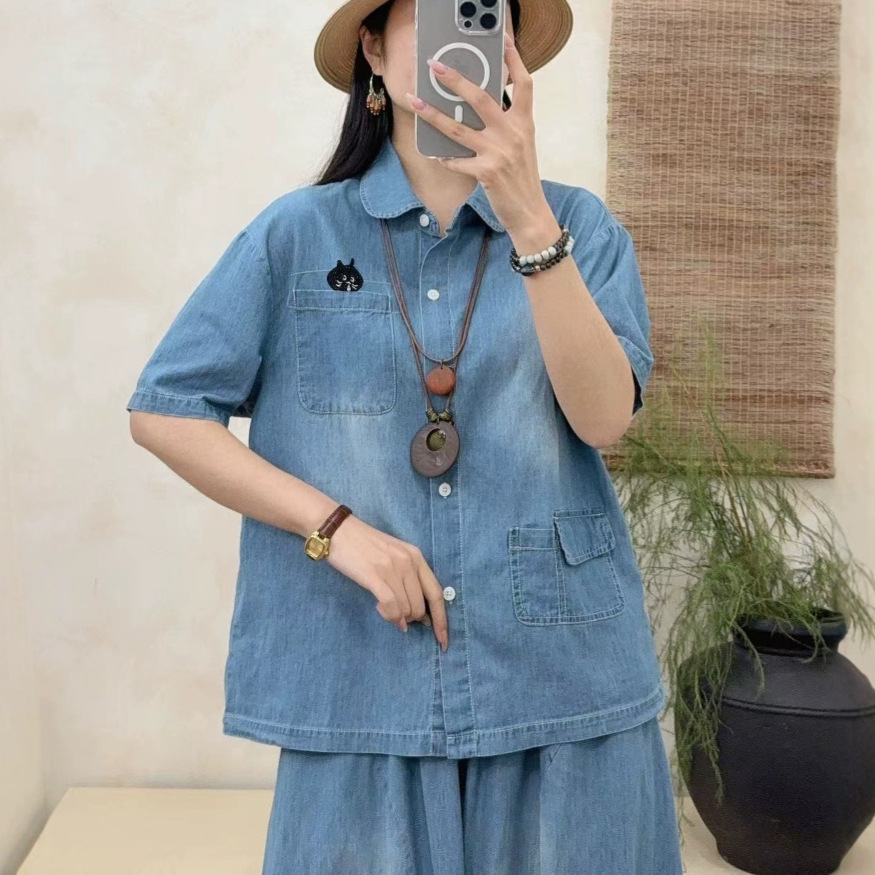 通勤カジュアル刺繍デニム半袖シャツ学院風上着ルーズパンツスカート2点セットレディース25380