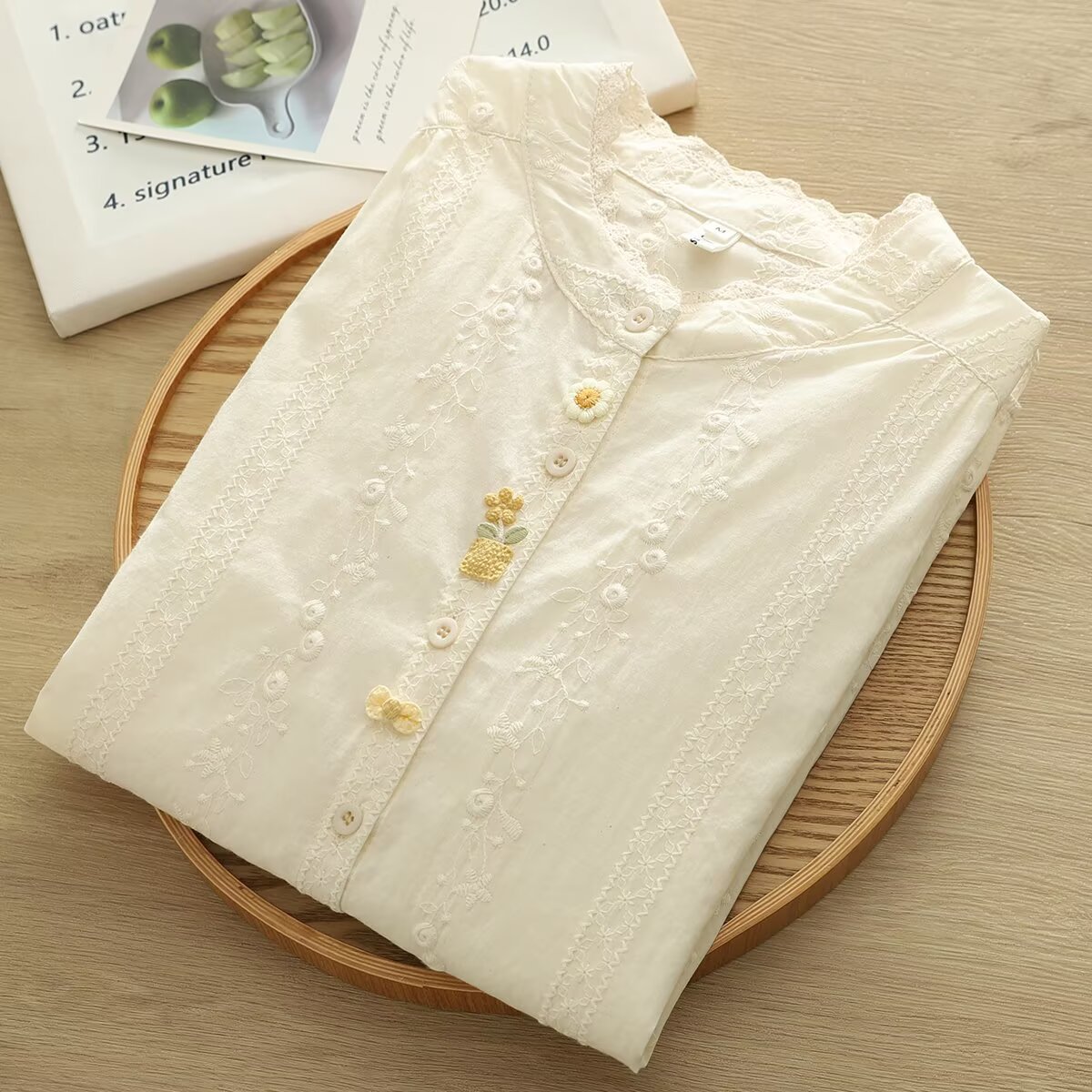 秋の新韓版文芸範刺繍二重糸シャツ木耳襟レース長袖ゆるい綿糸シャツ857