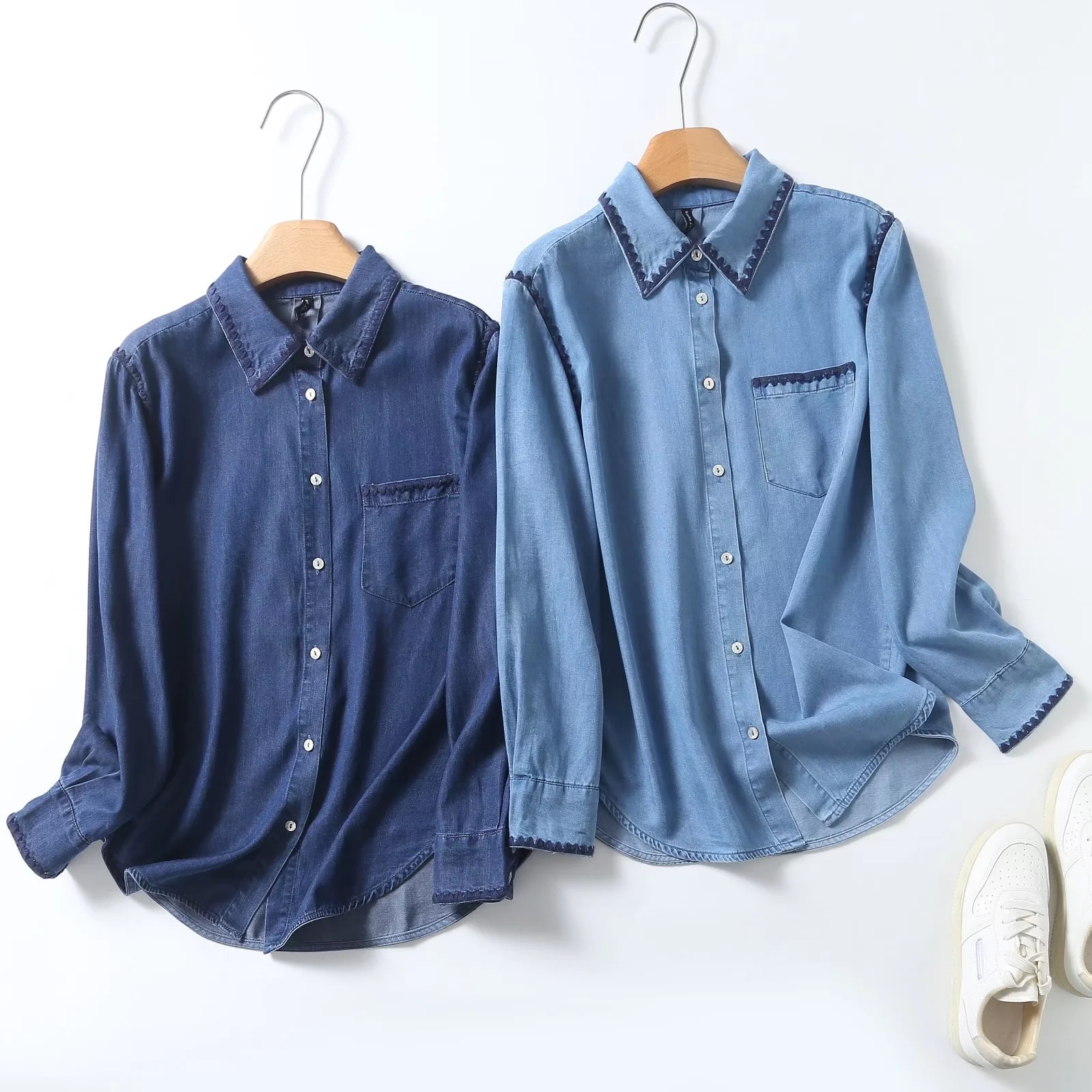 2389ポケット刺繍単列ボタン天糸カウボーイ長袖シャツ女2024春装新型カジュアル痩せ上着