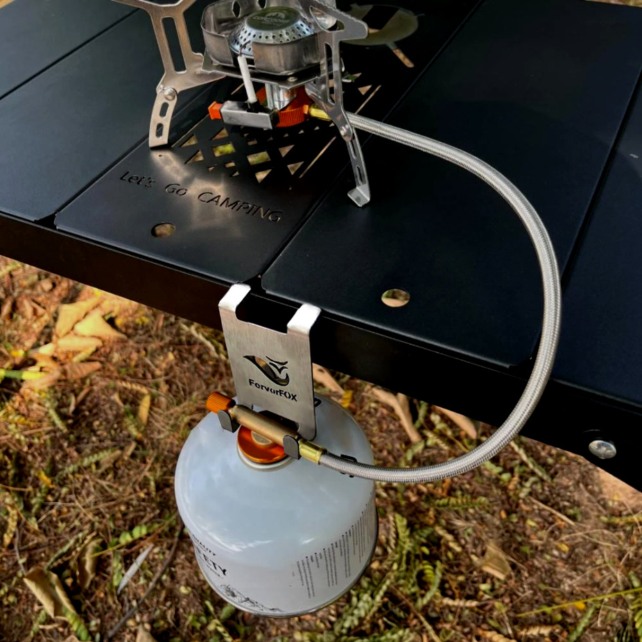 アウトドアストーブの頭のガスタンクをフックして携帯します。