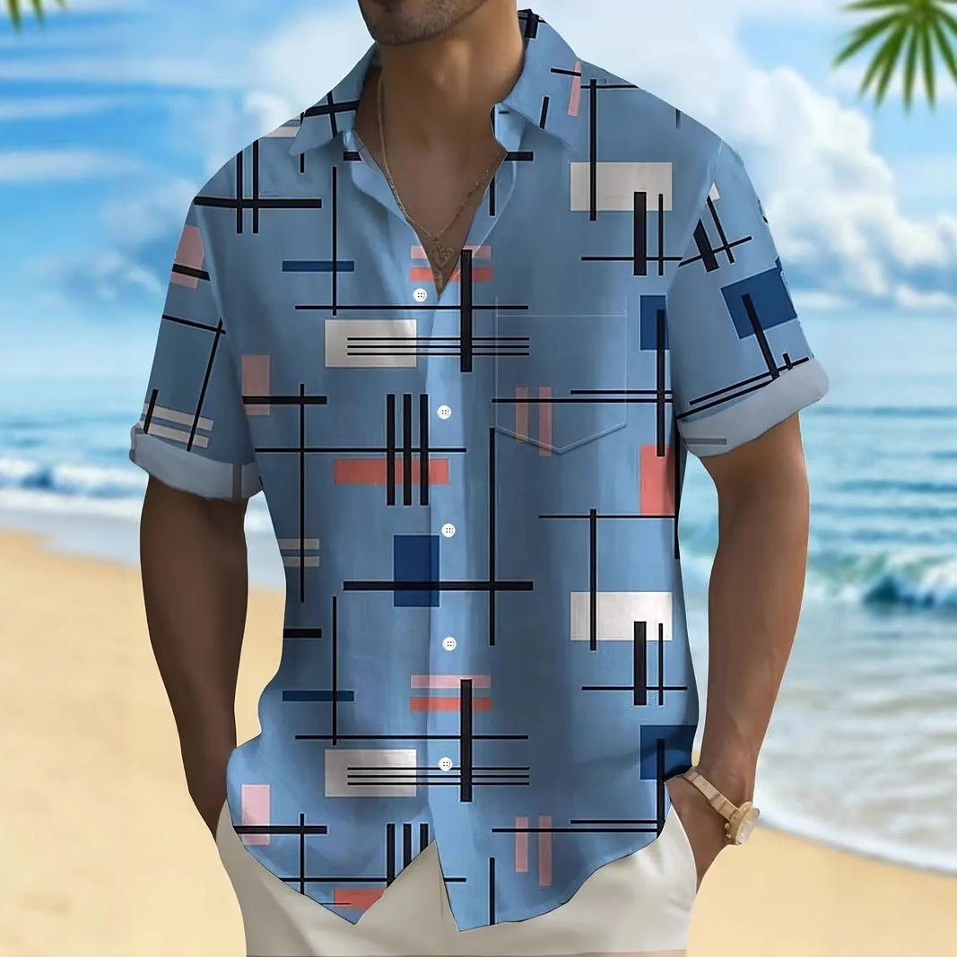 ハワイアンリゾートスタイルヨーロッパとアメリカのクロスボーダー3Dストライププリントメンズ半袖ボタンダウンシャツデイリーカジュアルシャツ