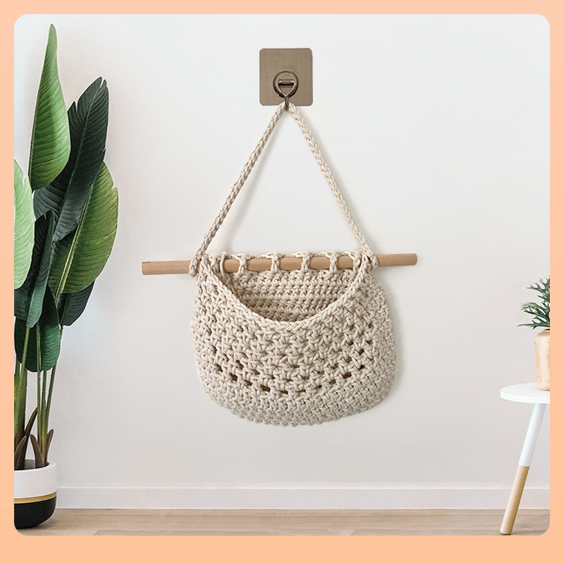 91N壁掛装飾収納かご三層果物網兜綿縄手編み壁掛け吊りかご木棒金果物