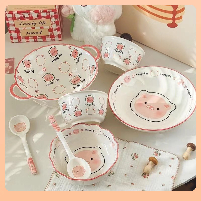 ✅漫画かわいい豚のカップラーメンの家庭用高颜値陶磁器の茶碗の皿