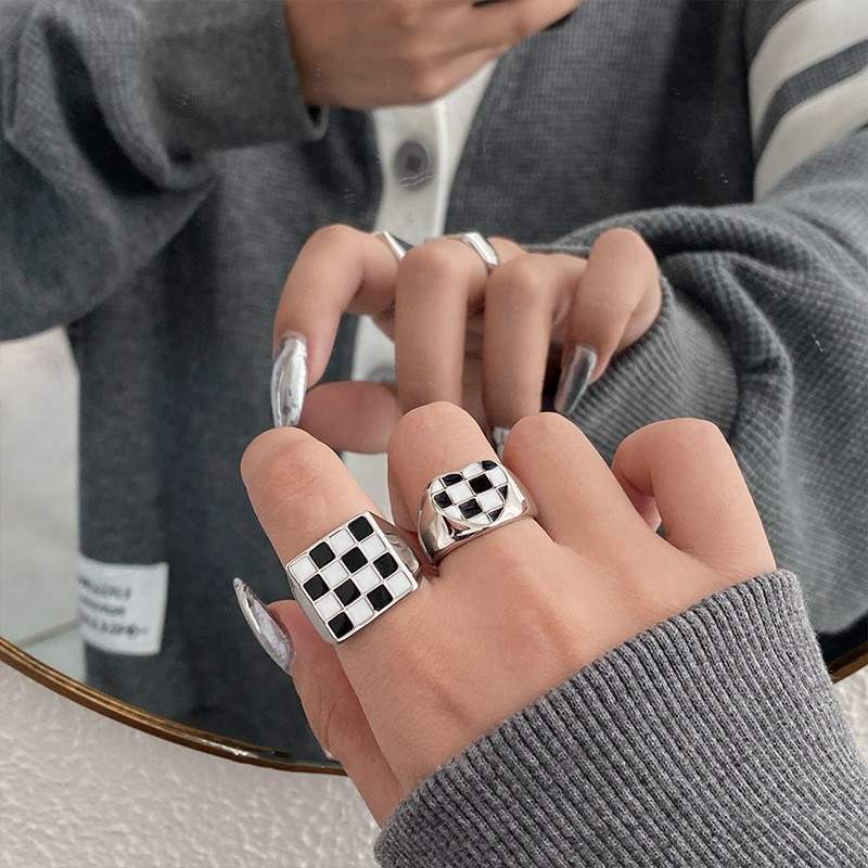 棋盤格滴釉薬開口指輪セット女性夏小衆デザイン冷淡風食指戒ファッション個性指環潮