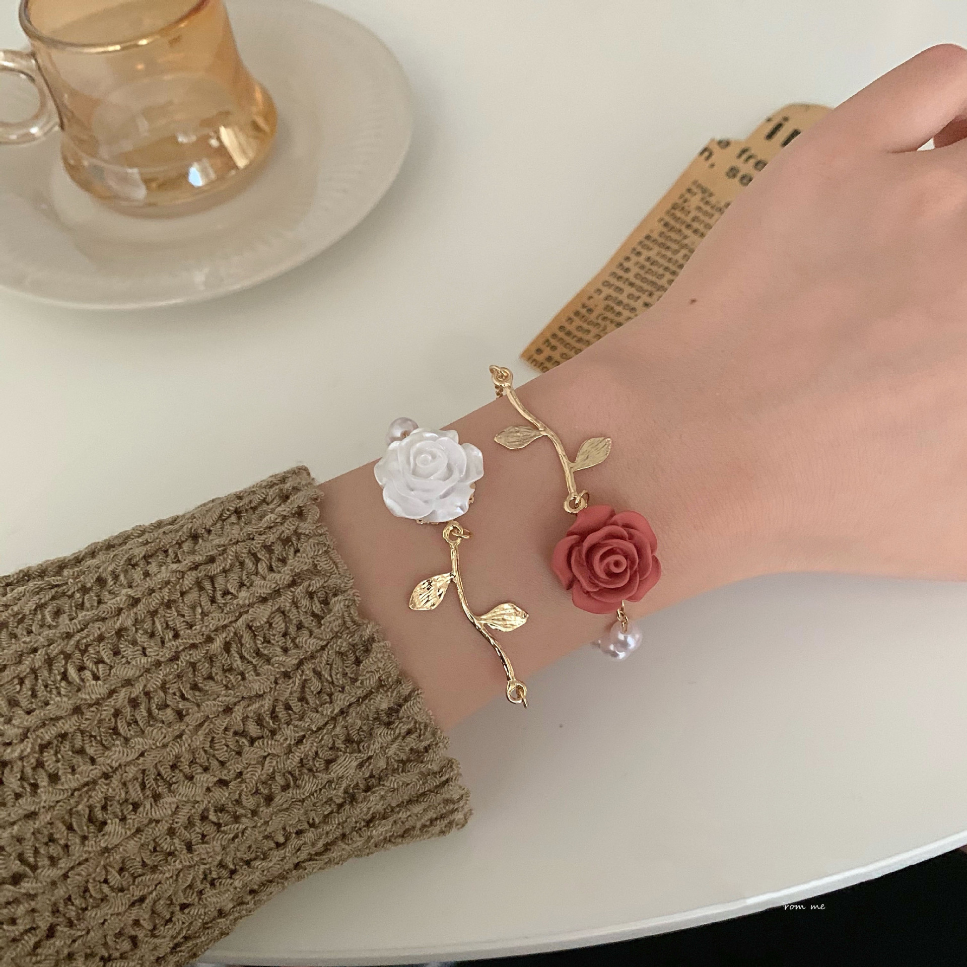 バラの花のブレスレットの白いバラのバロックの真珠のブレスレットの気質のフランスの高級感の手は森系の甘い美人を飾ります。
