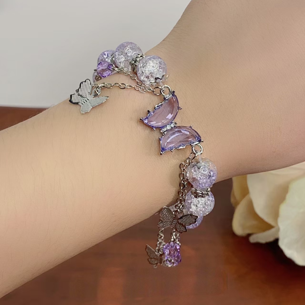 古風超仙気紫氷透感蝶ブレスレットフランスレトロ流蘇紫蝶ビーズブレスレットプレゼント