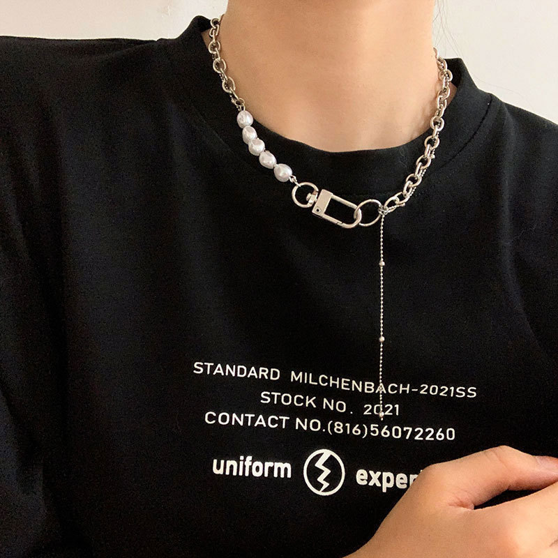 新しい日本と韓国のレトロなインスタイル多用途チタン鋼ネックレス女性のニッチファッションパール鎖骨チェーンセーターチェーン