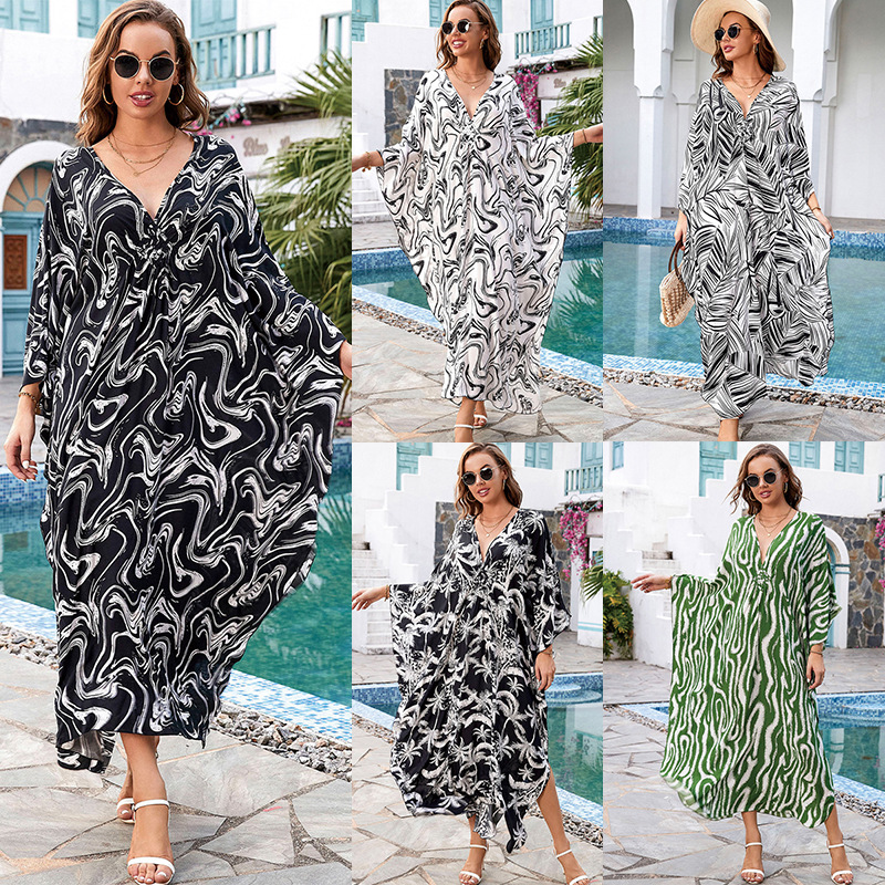2023爆発的な欧米の位置付けのプリントビーチブラウスの長い服のリゾートのスカートのワンピースのビキニの外で女性を掛けます。
