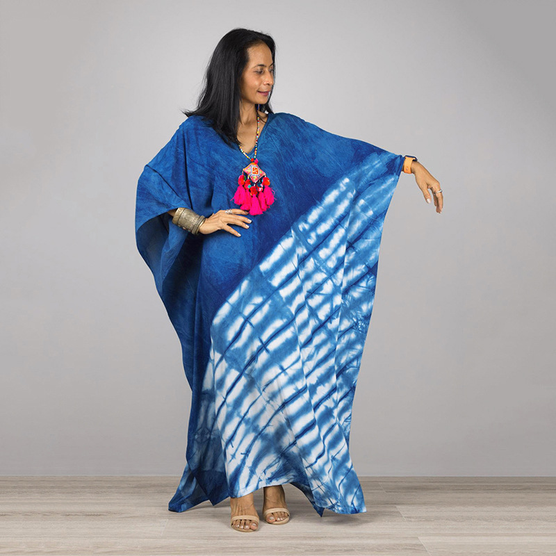 欧米人綿丈の青い葉の図案ビーチスカートのゆったりした大きいサイズのロングスカートのビキニの水着のブラウスの日焼け止めの女性