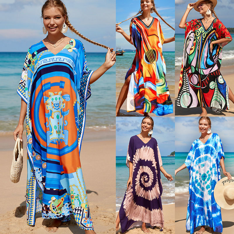 欧米の新型の人綿のプリントのビーチのスカートのゆったりしている長い服の海辺の休暇のビキニの水着のブラウスの日焼け止めの女性