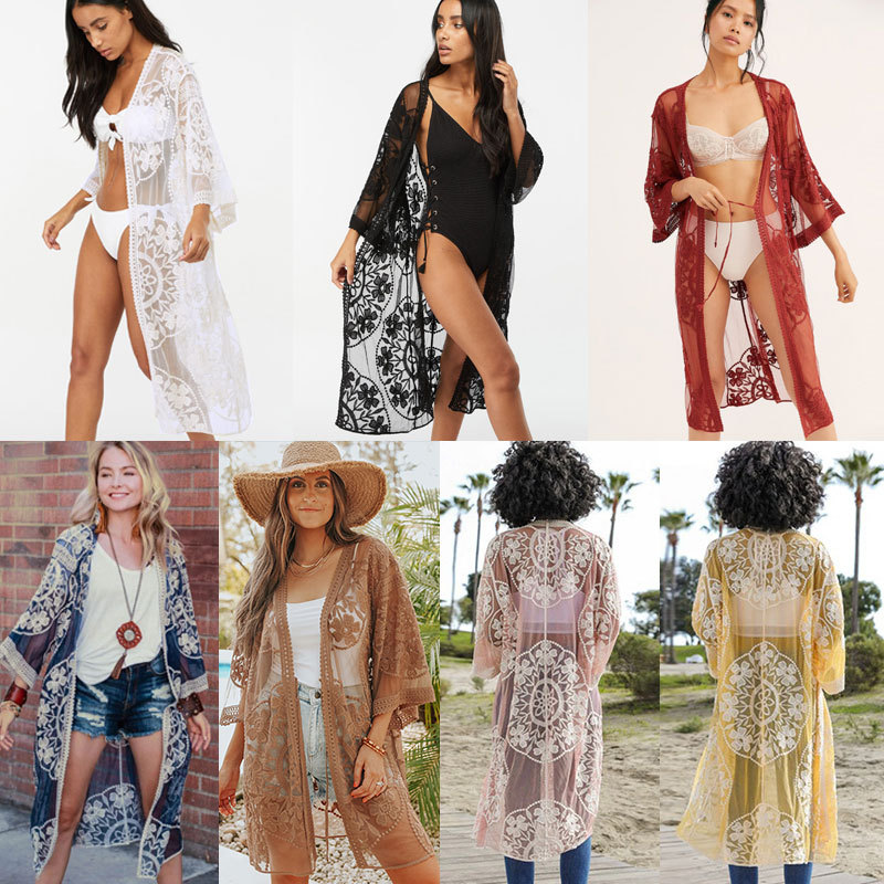 セクシーなレースの日焼け止め服の女性の中の長いタイプの休暇の水着の外でビキニのブラウスのビーチのコートに乗ります。