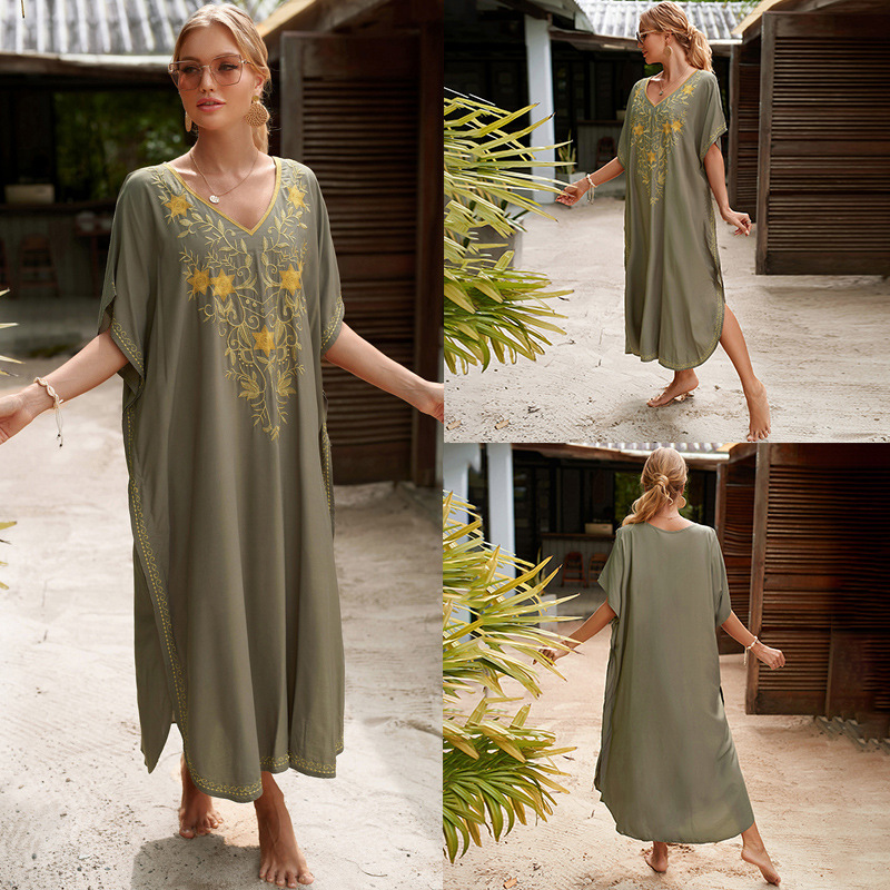 新型欧米人綿刺繍リゾートワンピース女性ゆるいロングスカートビーチ日焼け止めビキニブラウス