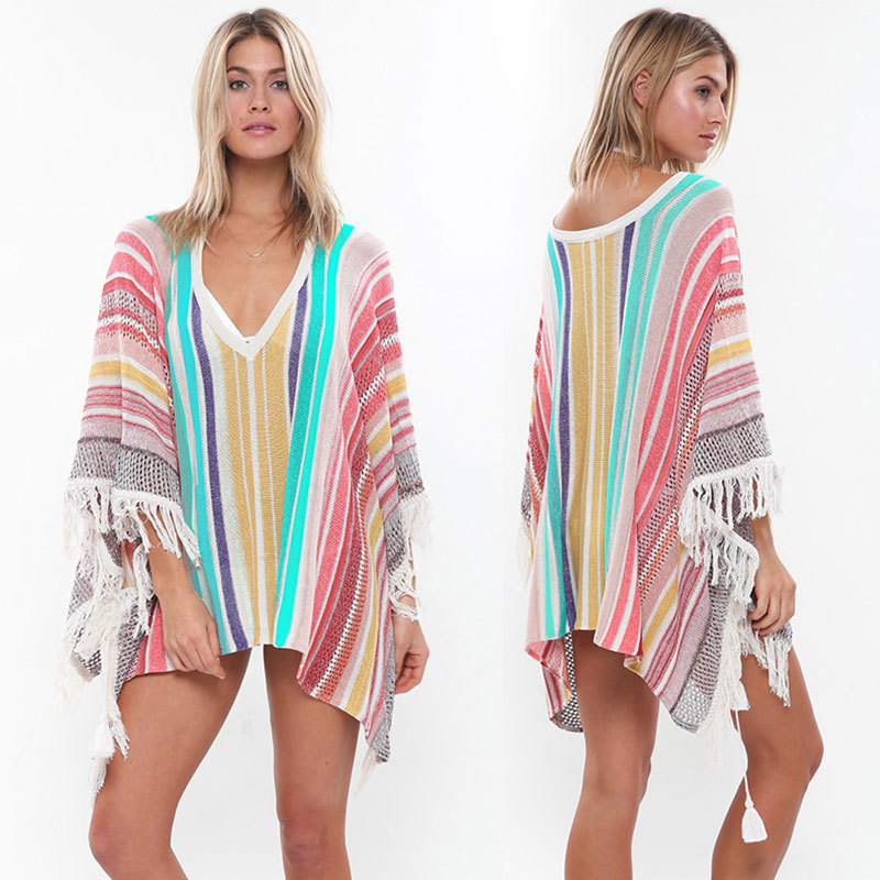 国境を越えた欧米のニットウェアのカラーの色合わせの縦縞のフリンジビーチのブラウスのビキニの水着の外で日焼け止めの女性を掛けます。