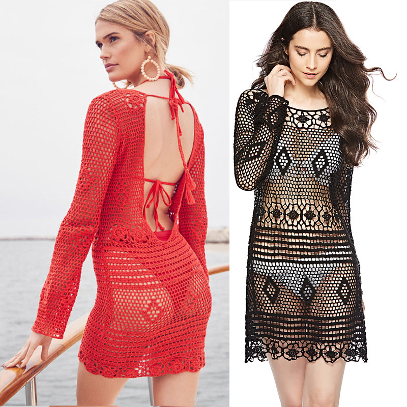 欧米の新型長袖レースの背中のフリンジのワンピースの透かし彫りのビキニのブラウスのビーチの日焼け止めの服