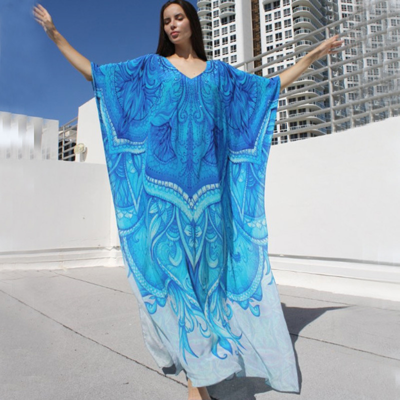 欧米の新型の超巨大な人綿の位置付けの花のゆったりしたビーチのコートの長い服のビキニのブラウスの休暇のワンピースの女性