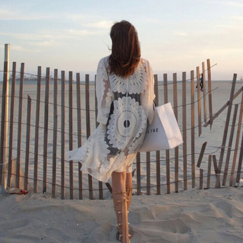 海辺の休暇レース刺繍の中の長い日焼け止め服の薄いカーディガンのコートのビキニの水着の外はビーチのブラウスに乗ります。