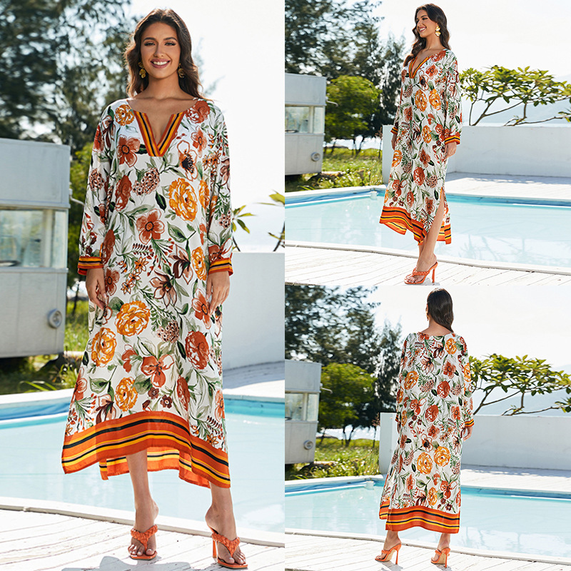 欧米の新型の位置付けのプリントの休暇の砂浜の外のワンピースの女性の日焼け止めの長いスカートの大きいサイズの長い服のビキニのブラウス