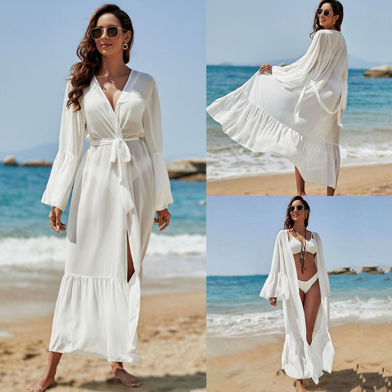 2023欧米のシフォンのラッパの袖の日焼け止めのカーディガンの長いタイプのビーチのコートの休暇のビキニの水着の外はブラウスを掛けます。