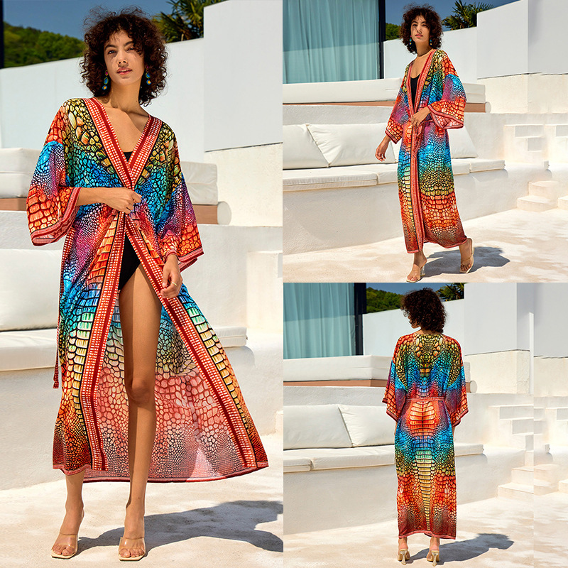 国境を越えた新型シフォン豹点ゆるいロングカーディガンビーチ日焼け止めコートビキニブラウス水着外着女性
