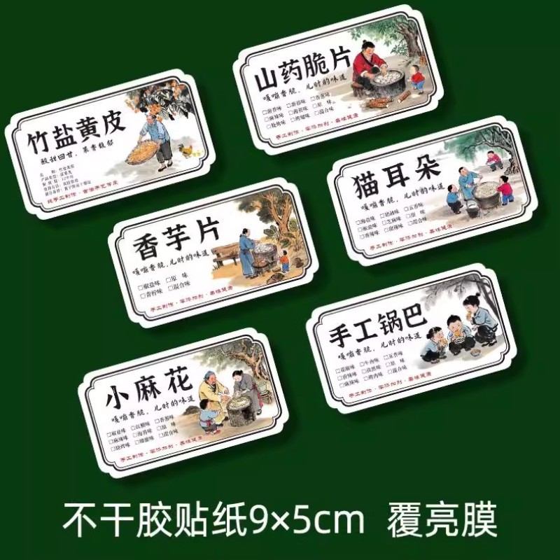 絶妙なクラシックスナックステッカー、クリスピーライスヤムチップス、猫耳ツイストタロイモチップスラベル、スパイシーペッパーとソルトの味のステッカー
