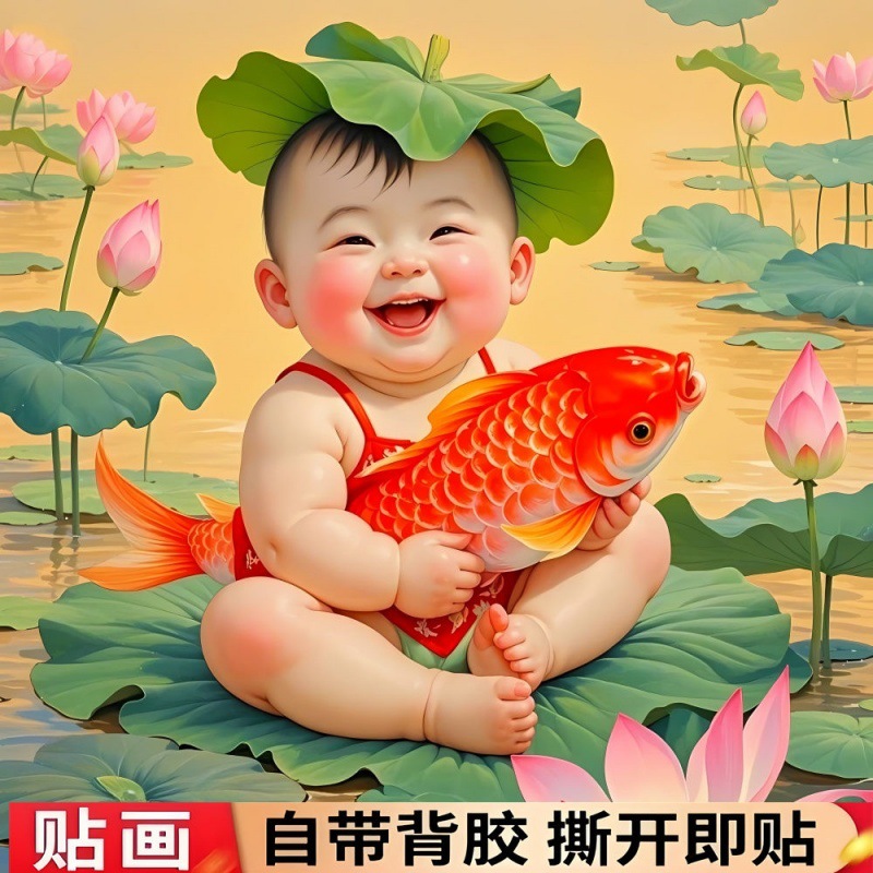 富の赤ちゃんが鯉を抱き、富と祝福を呼び込みます。リビングルーム、玄関、通路、廊下、部屋の装飾用の粘着ステッカーです。