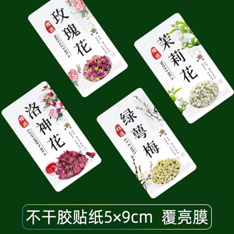 新しい緑の花びら梅ステッカー白梅ドライフラワーローズジャスミンローゼル茶ラベルステッカー緑の花びら梅商標