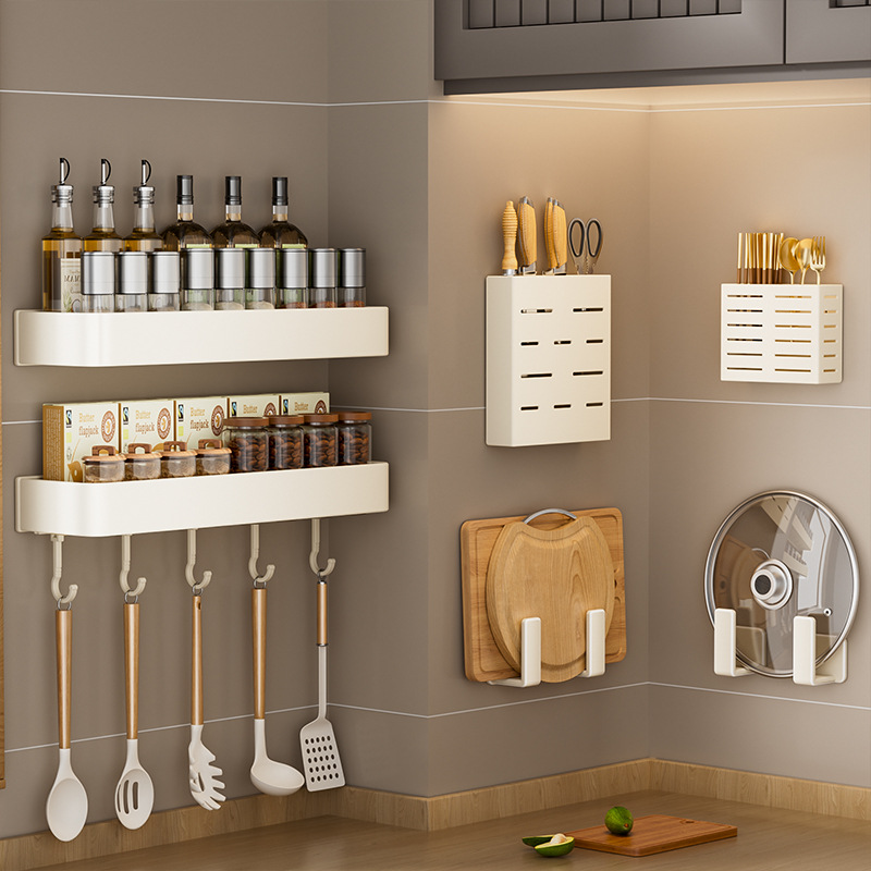 台所の棚に穴を開けない壁掛け式の刃物棚調味料用品大全フック箸籠鍋蓋棚セット