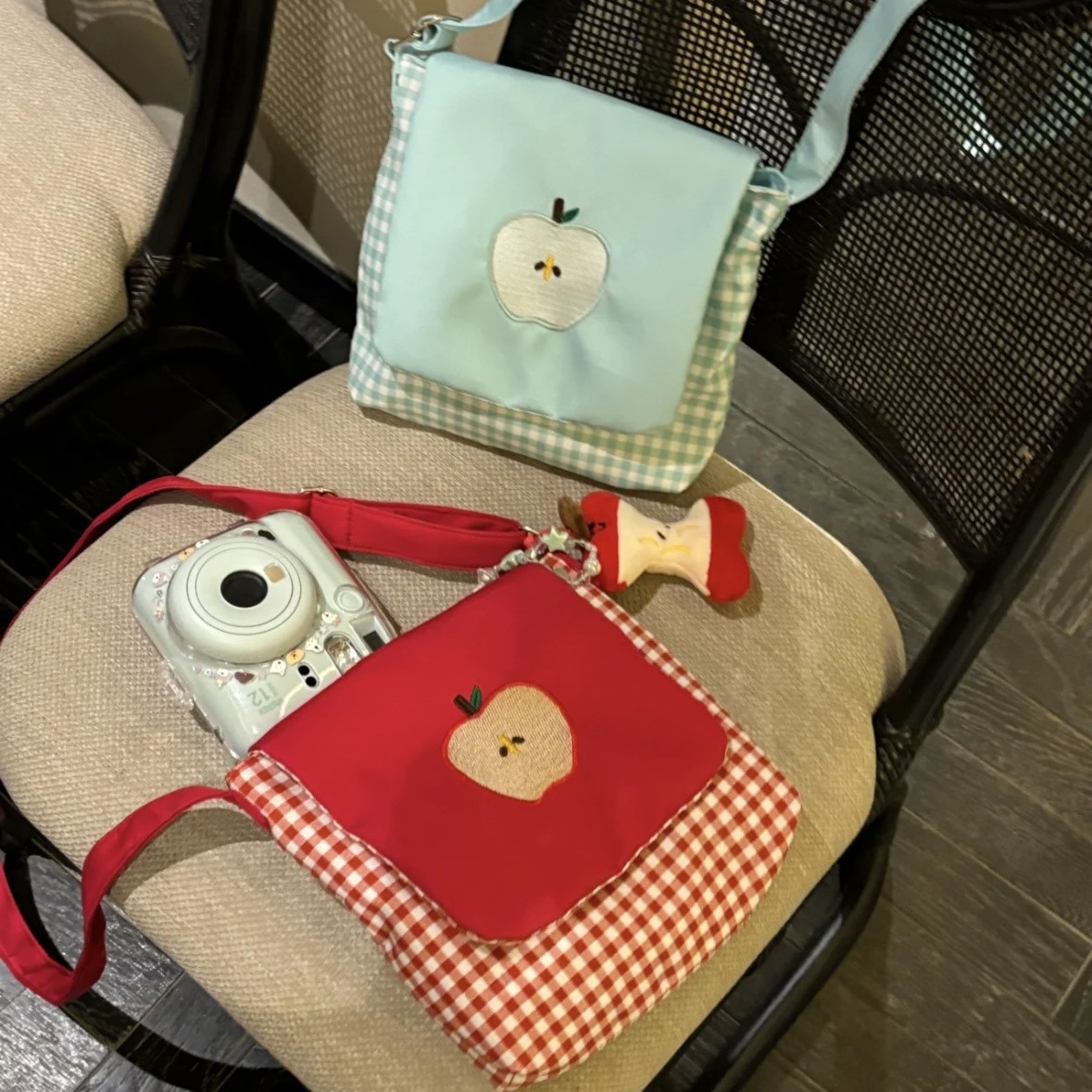 かわいい夏のアップル刺繍クロスボディバッグ、ティールグリーンのフリップトップ収納バッグ、ポータブルチェック柄通勤用小型バッグ