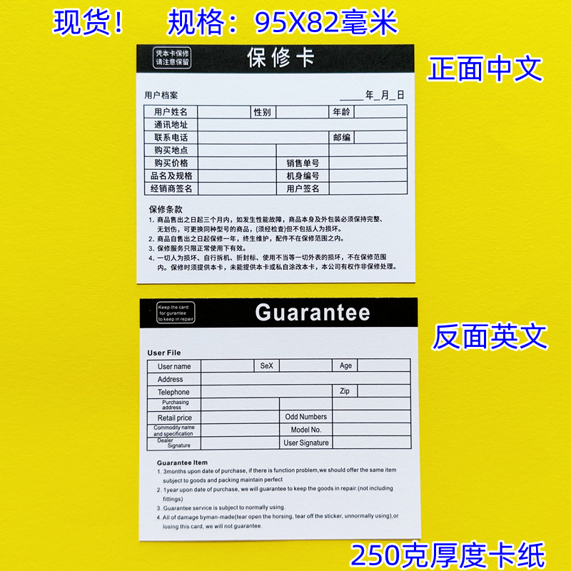 汎用中英語両面保証カード出荷後保証カードラベル95x82mm 1枚8点