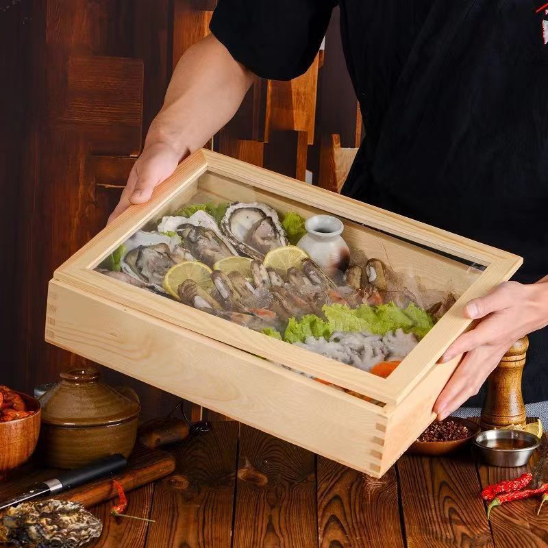 木製日本式サーモン刺身木箱鍋焼肉蓋付き食材収納箱寿司生鮮包装箱