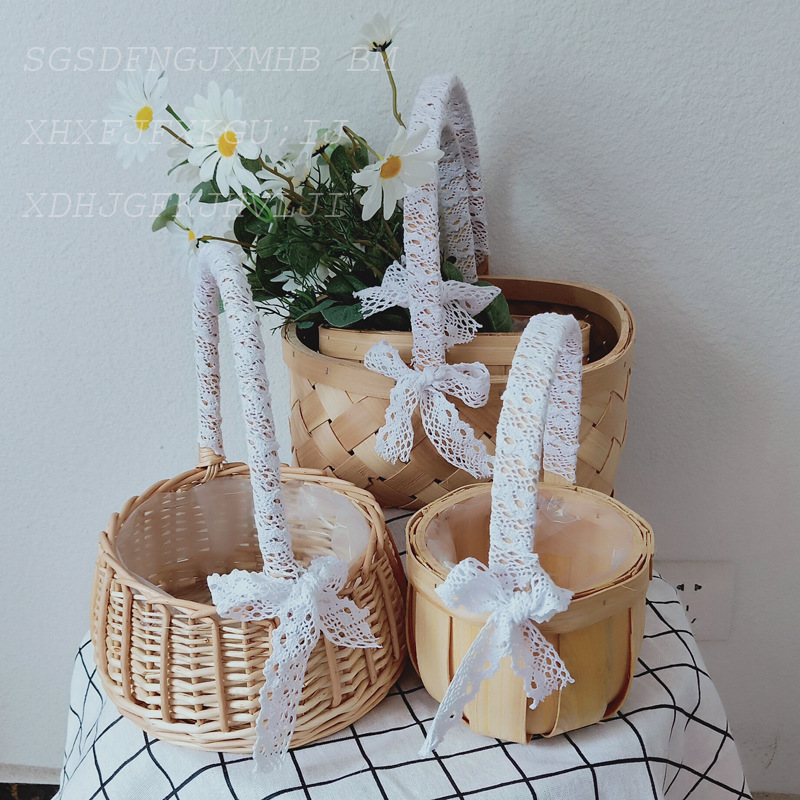 ポータブルレース編み籐バスケット、ウッドチップフラワーバスケット、フラワーアレンジメントギフト包装バスケット、コンパニオンギフトバスケット、リターンギフトバスケット