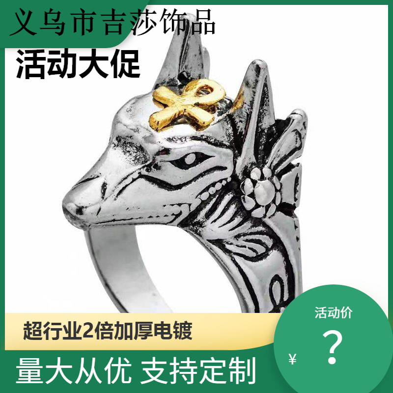 レトロな泰銀アヌビス神防身破窓チタン鋼指輪死神十字架胡狼頭指環手飾り