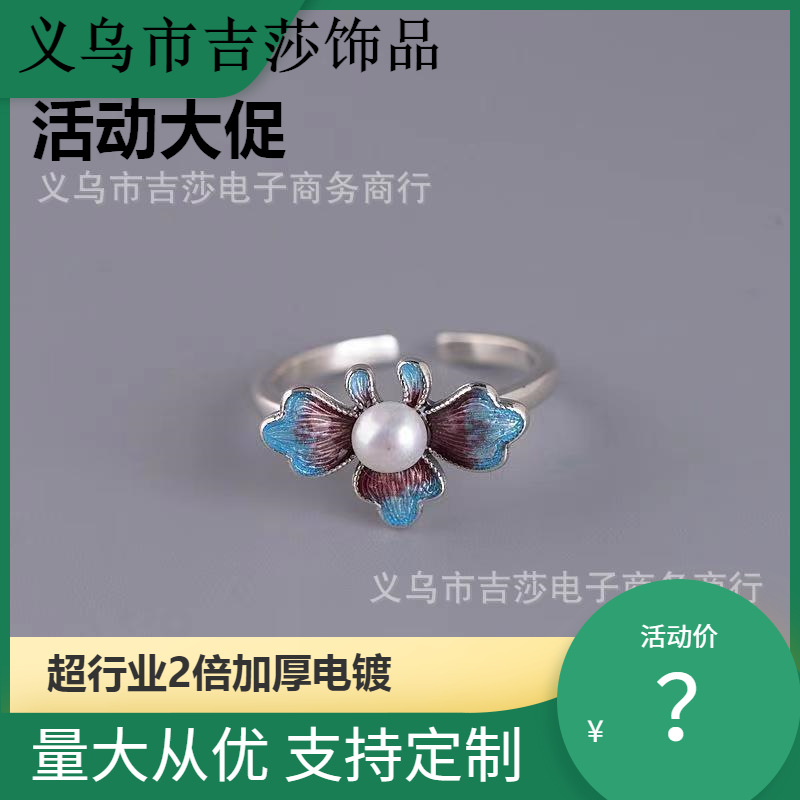 エナメル色の牡丹の花の指輪の泰銀の復古の女性のファッションの民族の風は青い真珠の開口部を焼きます。
