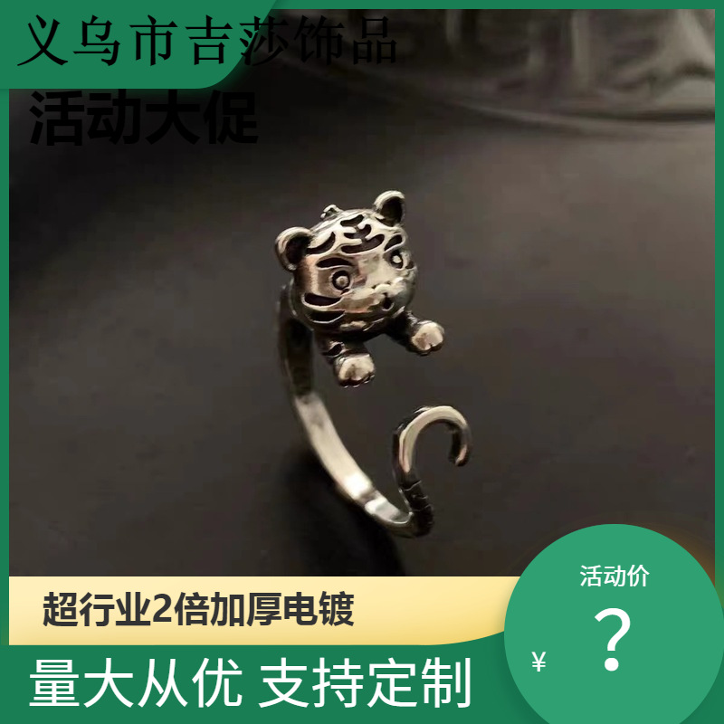 香港風復古ファッション銀色のトラの指輪の女性の国潮泰銀は旧指環の本命年の虎の頭をして虎年を戒めます。