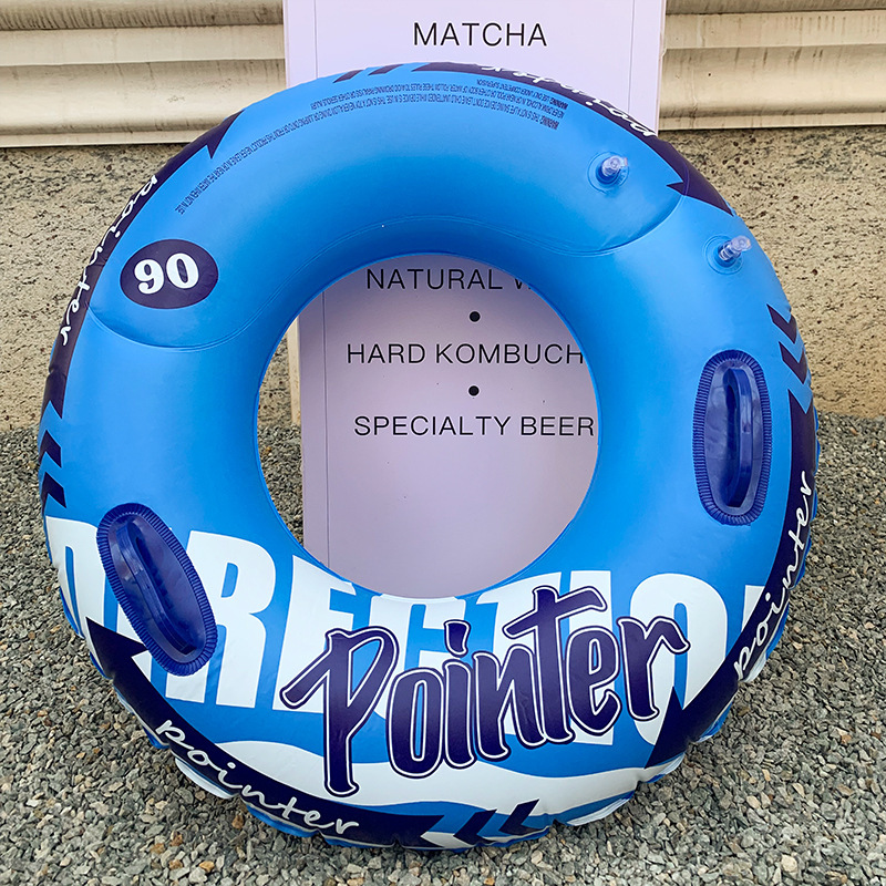 水泳館はよく売れています。黒いタイヤの浮き輪は大人で通用します。