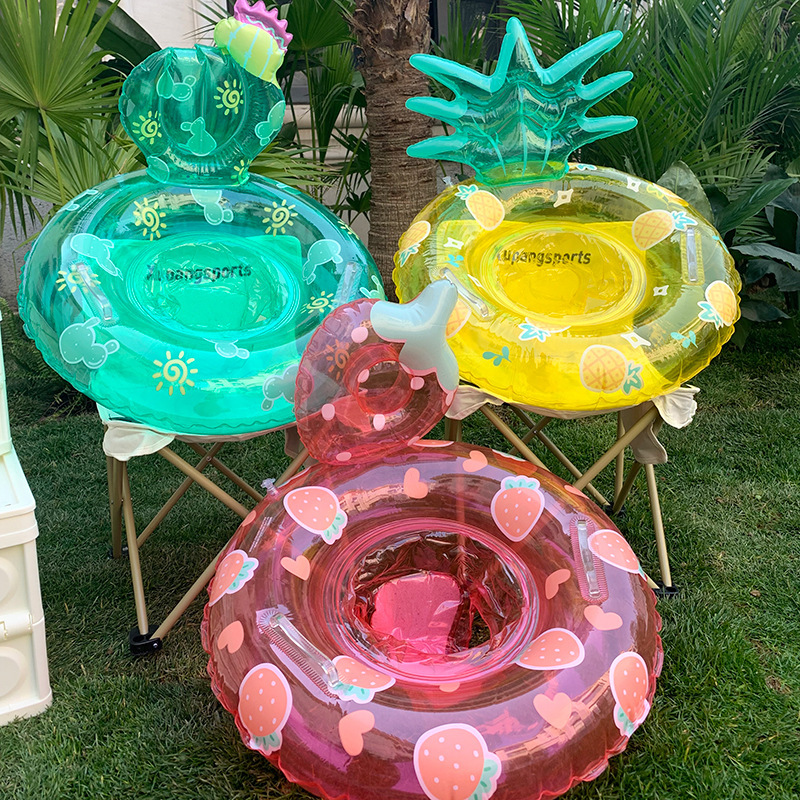 アニメの空気入れ水上のかわいいイチゴの子供は取っ手のスポンジの底の座る輪を持って果物の形の浮き輪を作ります。