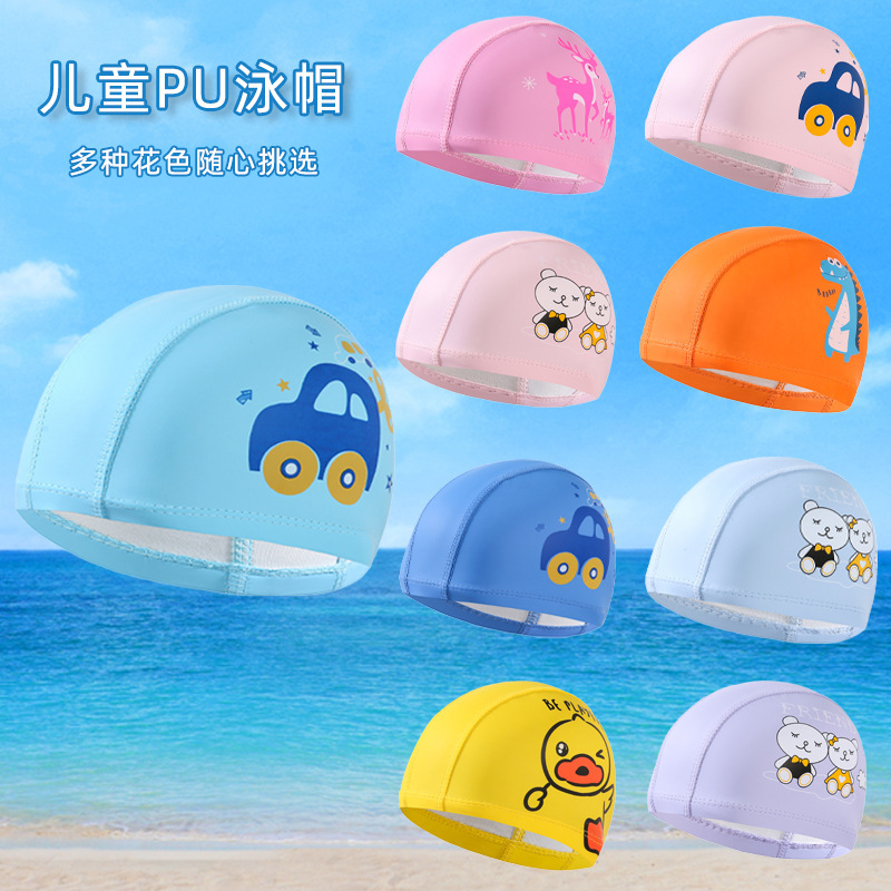 新しい起爆印刷ロゴ子供のアヒルの水泳帽防水puコーティング水泳帽かわいいアニメ水泳帽卸売り