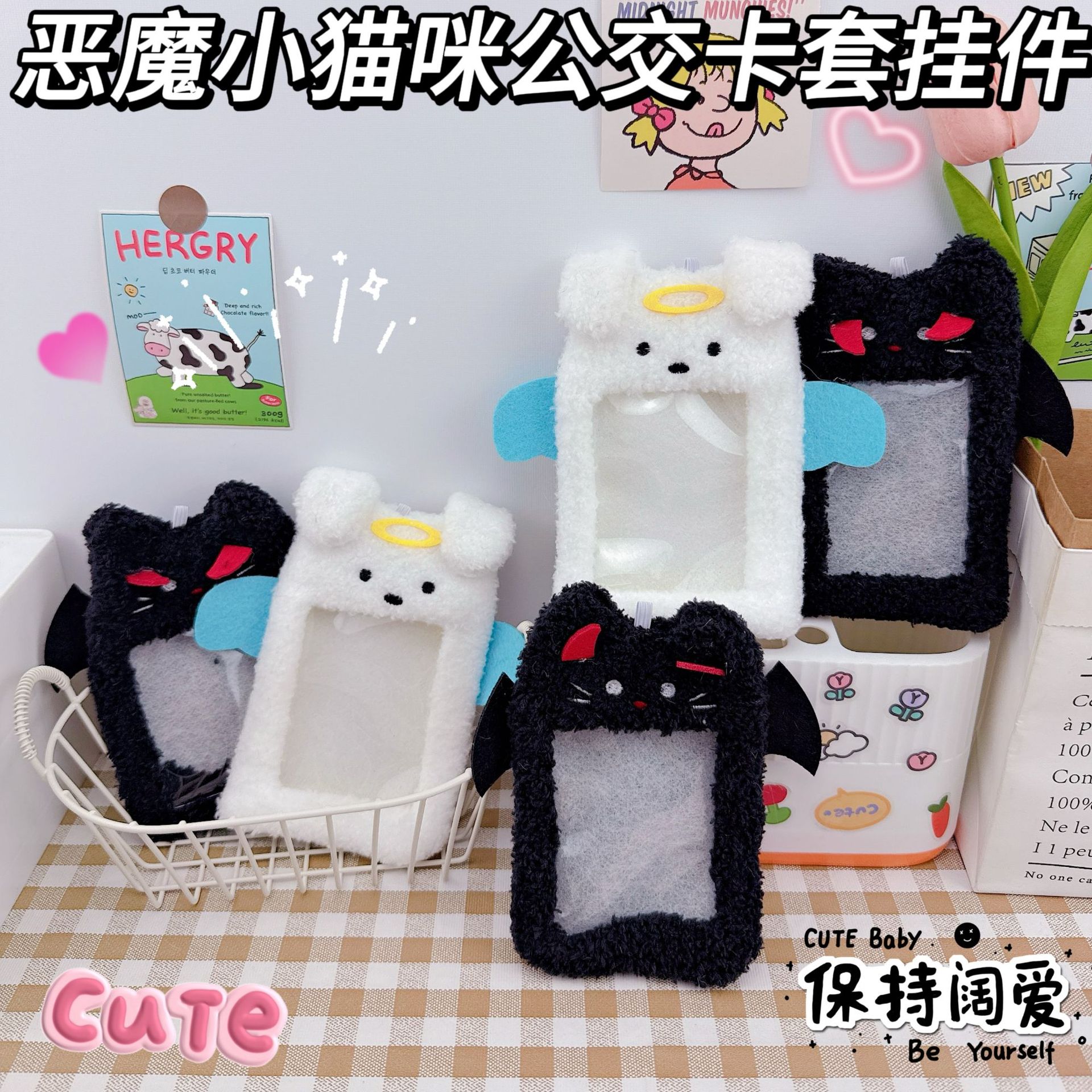 小悪魔の猫のぬいぐるみのカードカバーの学生の証明書は食事のカードを収納して星の愛豆の保護カバーのキーホルダーを追いかけます。