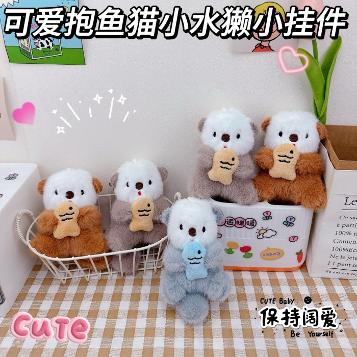 魚を抱いている子猫のラッコのキーホルダーの小さいペンダントのアイデアのぬいぐるみは魚を抱いています。